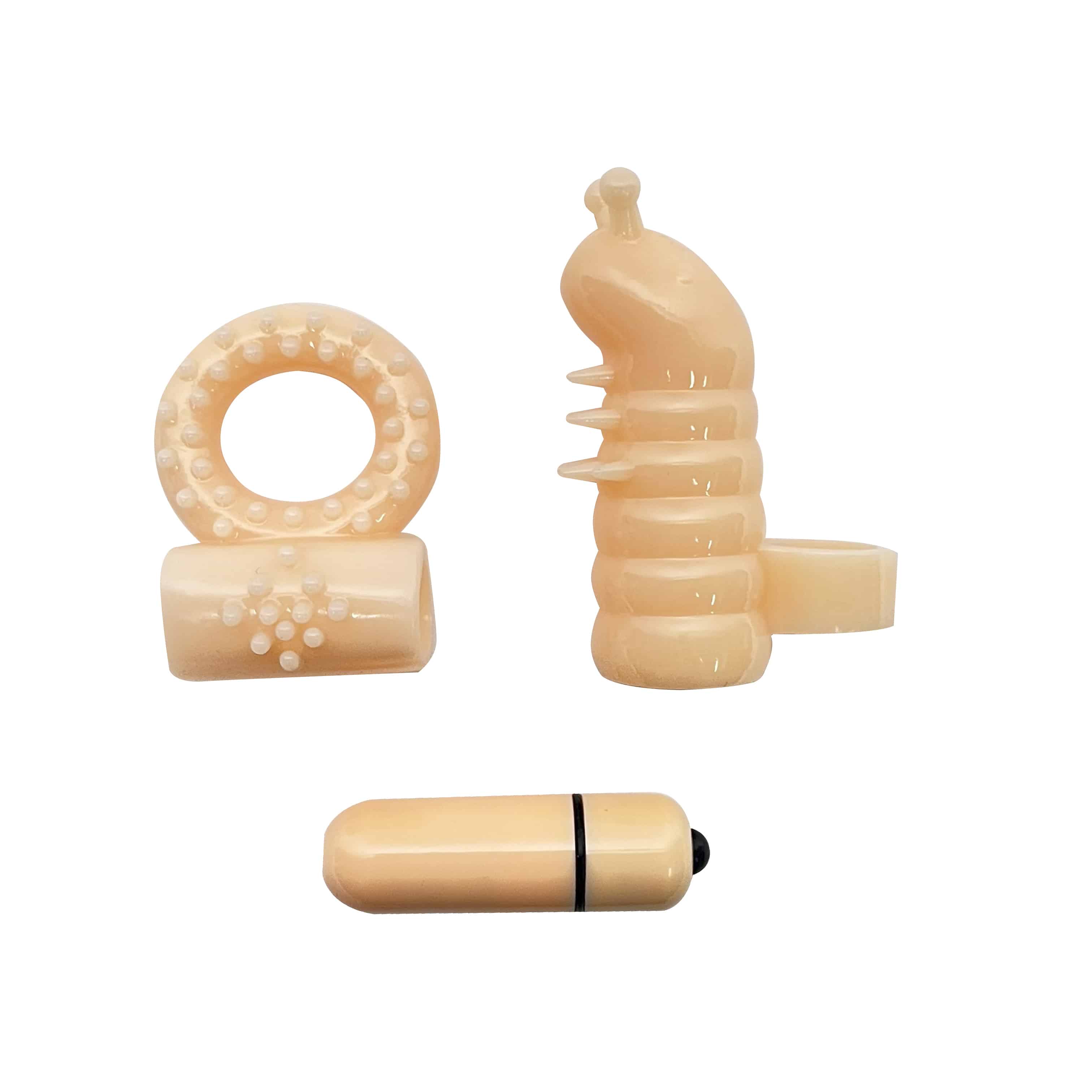 ¿Quieres probar distintas estimulaciones?, Ya esta en Starsex un pack que te permitirá experimentar con sus texturas y no solo eso porque viene equipado con una bala vibradora que se puede remover del anillo peneano y podrás recorrer distintas zonas con el dedo estimulador.